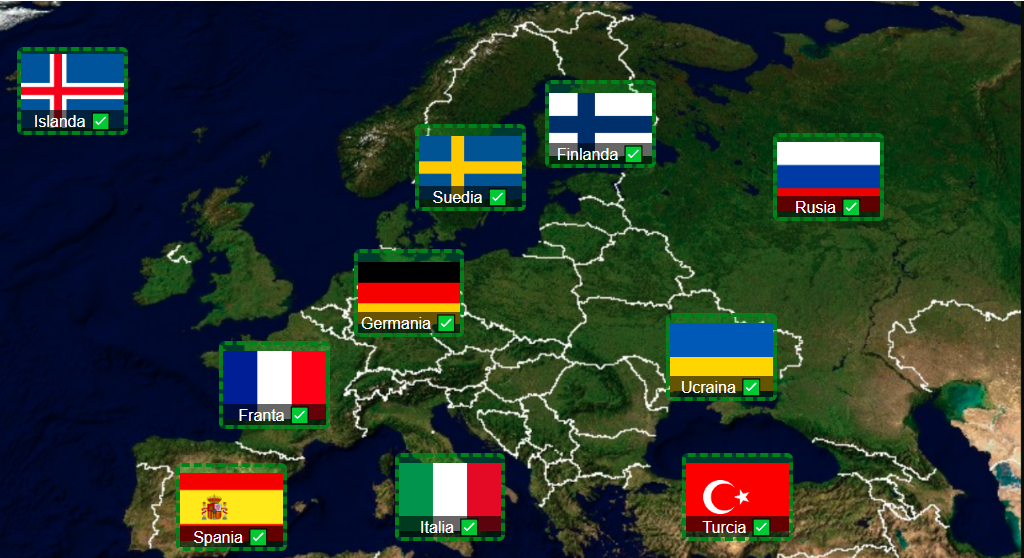 Tarile Europei Joc geografie de tip harta/map cu Tarile din Europa . Invata pentru bac geografie prin joc intr-un mod distractiv sa identifici Tarile din Europa. Navigheaza pe harta dand click pe tarile Europei si afla denumirea lor. Pregateste-te pentru Bac Geografieintr-un mod inteligent prin joc |